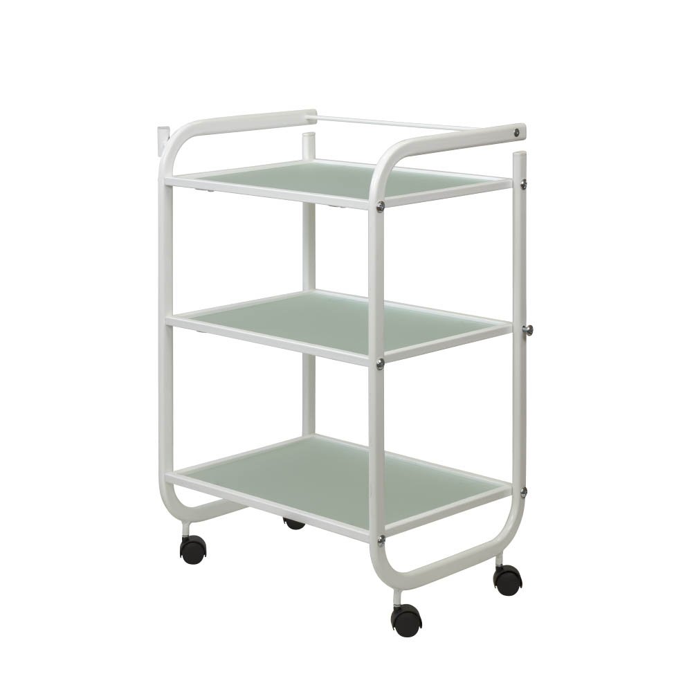 Комплектация: металлический каркас, три стеклянные полки с бортиками, четыре колеса.