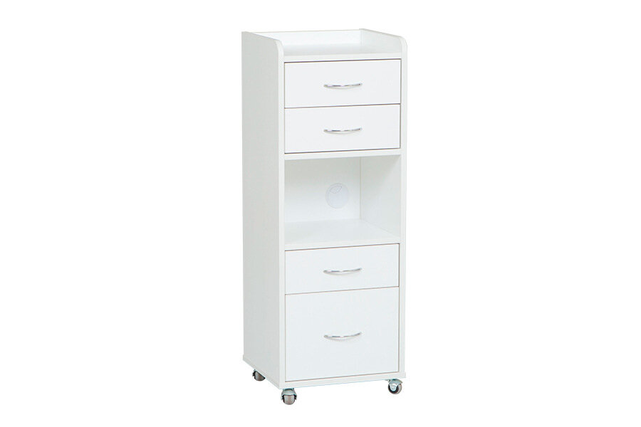 Для размещения инструментов, приборов, косметологических препаратов и прочих принадлежностей предусмотрено две удобные полки и четыре выдвижных ящика различной высоты,