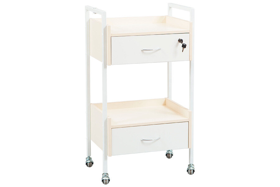 Косметологическая тележка ТК-2 имеет надежный стальной каркас, специальное крепление для лампы-лупы, ящики, закрывающиеся на ключ, а также две полки с бортиками для размещения оборудования и инструментов.