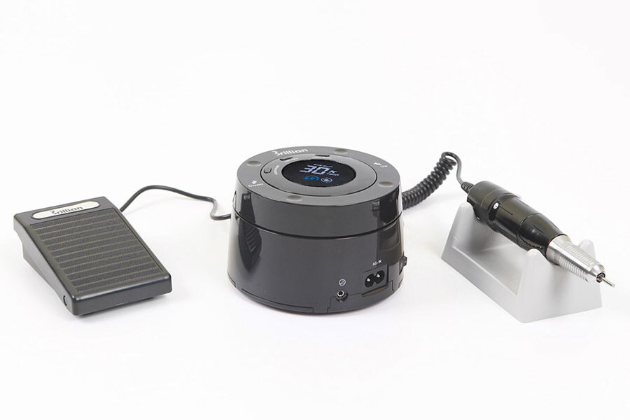 Компактный аппарат для проведения процедур маникюра и педикюра Brillian Black имеет цифровое табло, которое показывает выбранную скорость вращения.