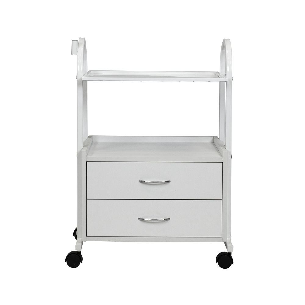 Тележка имеет вместительную тумбу с двумя выдвижными ящичками, в которой разместятся всё необходимое оборудование, а на верхней полке мастер может разложить принадлежности, использующееся во время рабочего процесса.