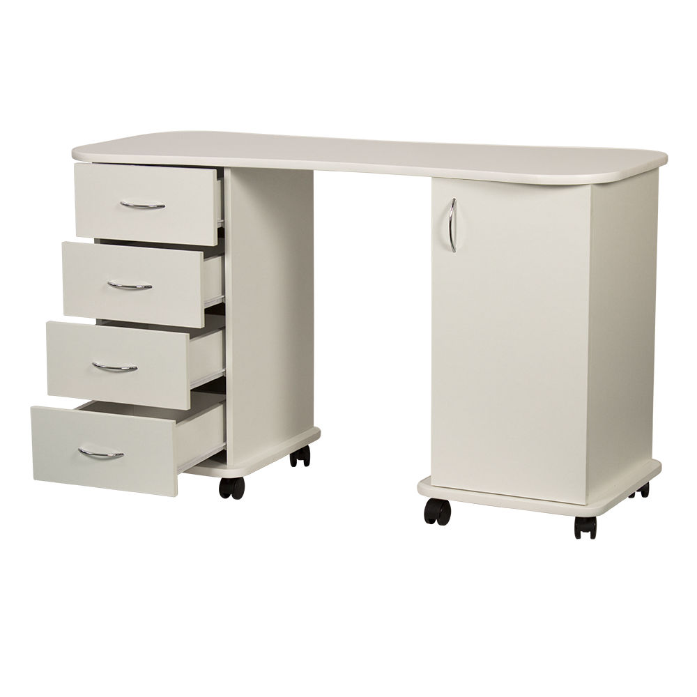 Стол оснащен удобной широкой столешницей, форма которой обеспечит комфорт мастеру и клиенту в процессе выполнения маникюра.