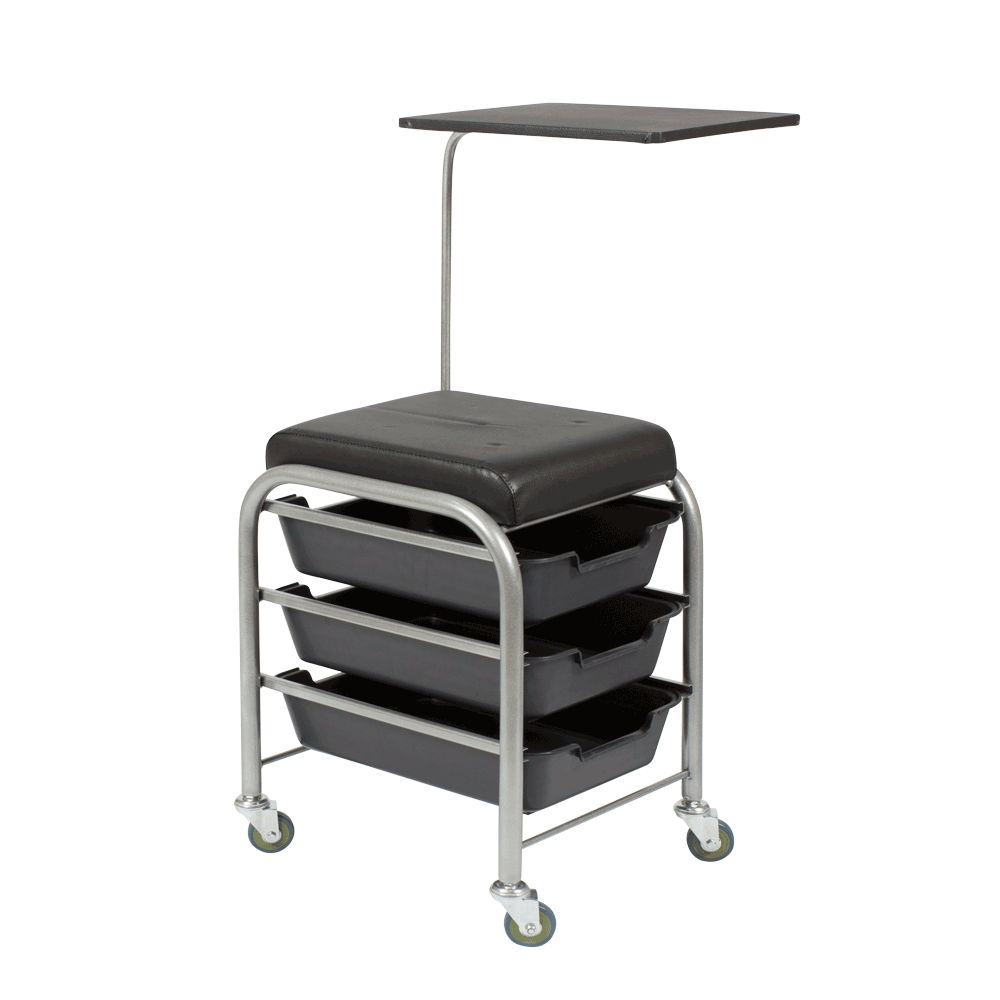 Комплектация: сиденье, металлический каркас на колесах, три выдвижных ящика, полка на стойке.