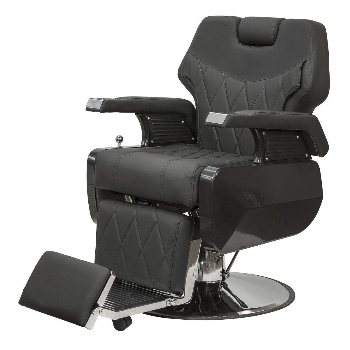 Широкое сидение с массивными подлокотниками позволит клиенту максимально расслабиться во время бритья и стрижки.