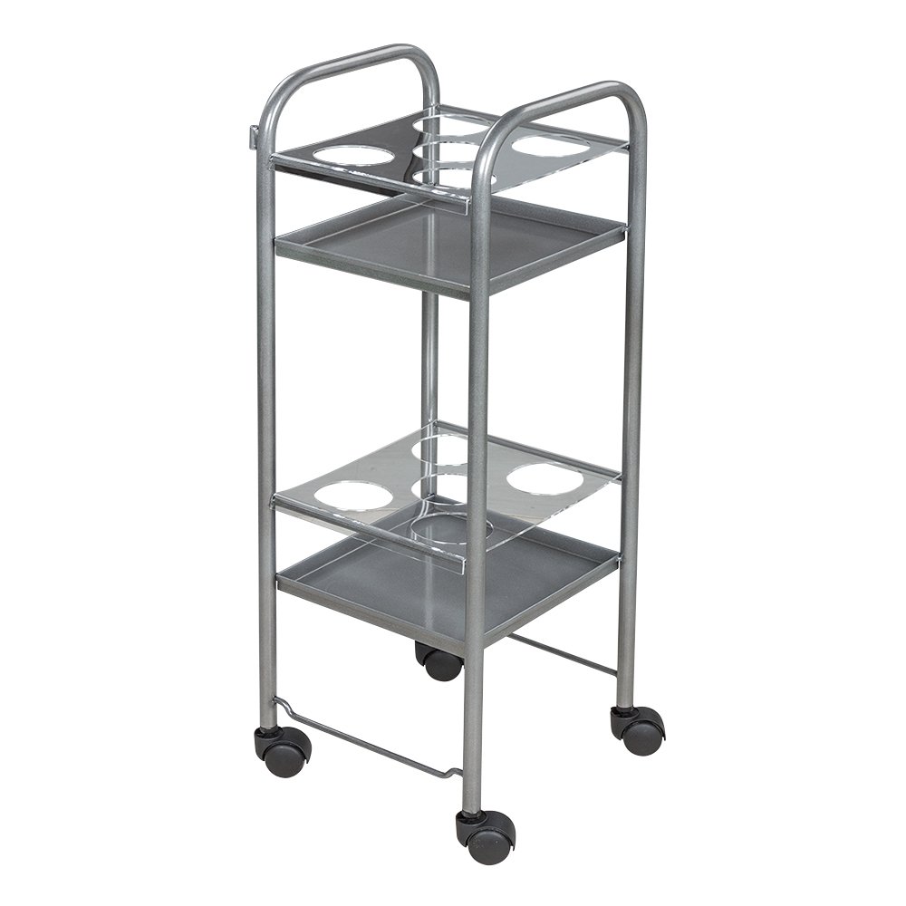 Стильная и функциональная тележка для шампуней Синди-01 оснащена металлическим каркасом, металлическими полками и удерживающими пластинами.