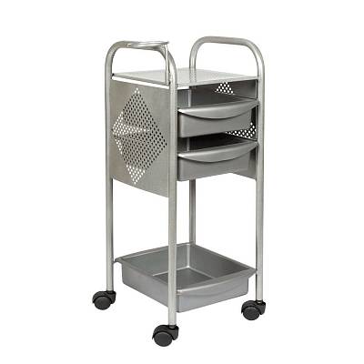 Комплектация: металлический каркас на колесах, три выдвижных ящика, верхняя полочка, держатель для фена.