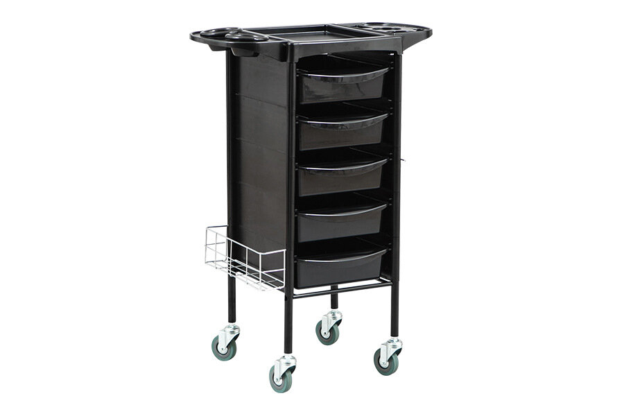Парикмахерская тележка SD-3013B с навесными панелями, металлическим держателем фена и съёмной нижней корзиной.