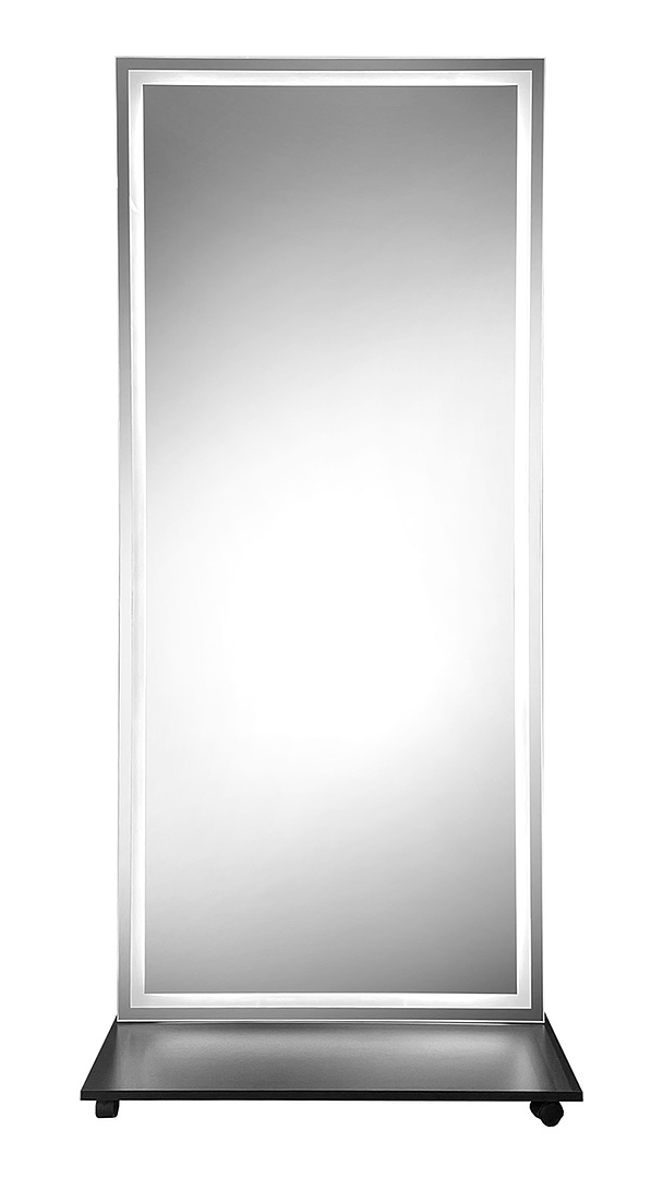 Подсветка носит декоративный характер. Зеркало можно повесить на стену или установить на платформу с колесами (идет в комплекте).