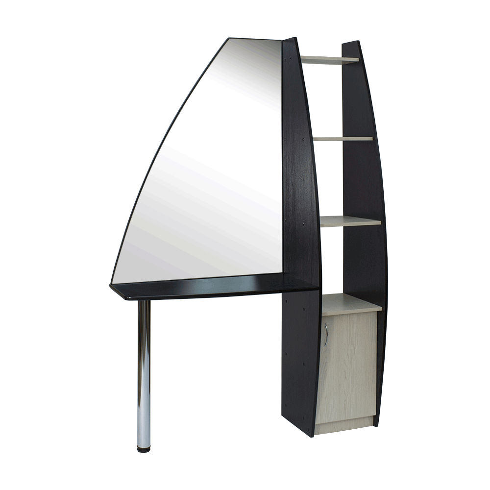 Одностороннее парикмахерское зеркало Сапфир комплектуется удобной столешницей, шкафчиком с полками и тумбой с хромированной ручкой и замком.