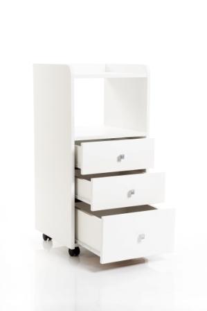 Столик имеет три ящика и две открытые полки, установлен на колеса благодаря которым его можно легко и удобно перемещать по кабинету.