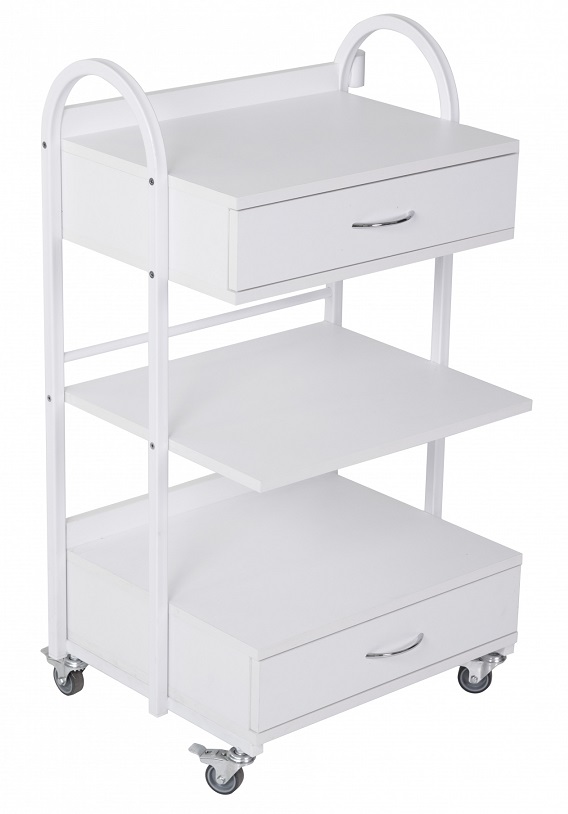 Малогабаритный и маневренный косметологический столик-тележка Макси 2 отлично подойдет для применения в кабинетах косметолога, маникюра и педикюра.