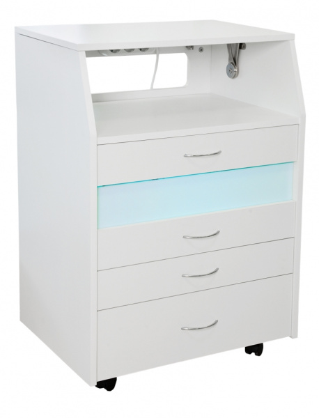 Тумба имеет одну полку и четыре выдвижных ящика, один из которых оснащен УФ-лампой мощностью 8 Ватт.
