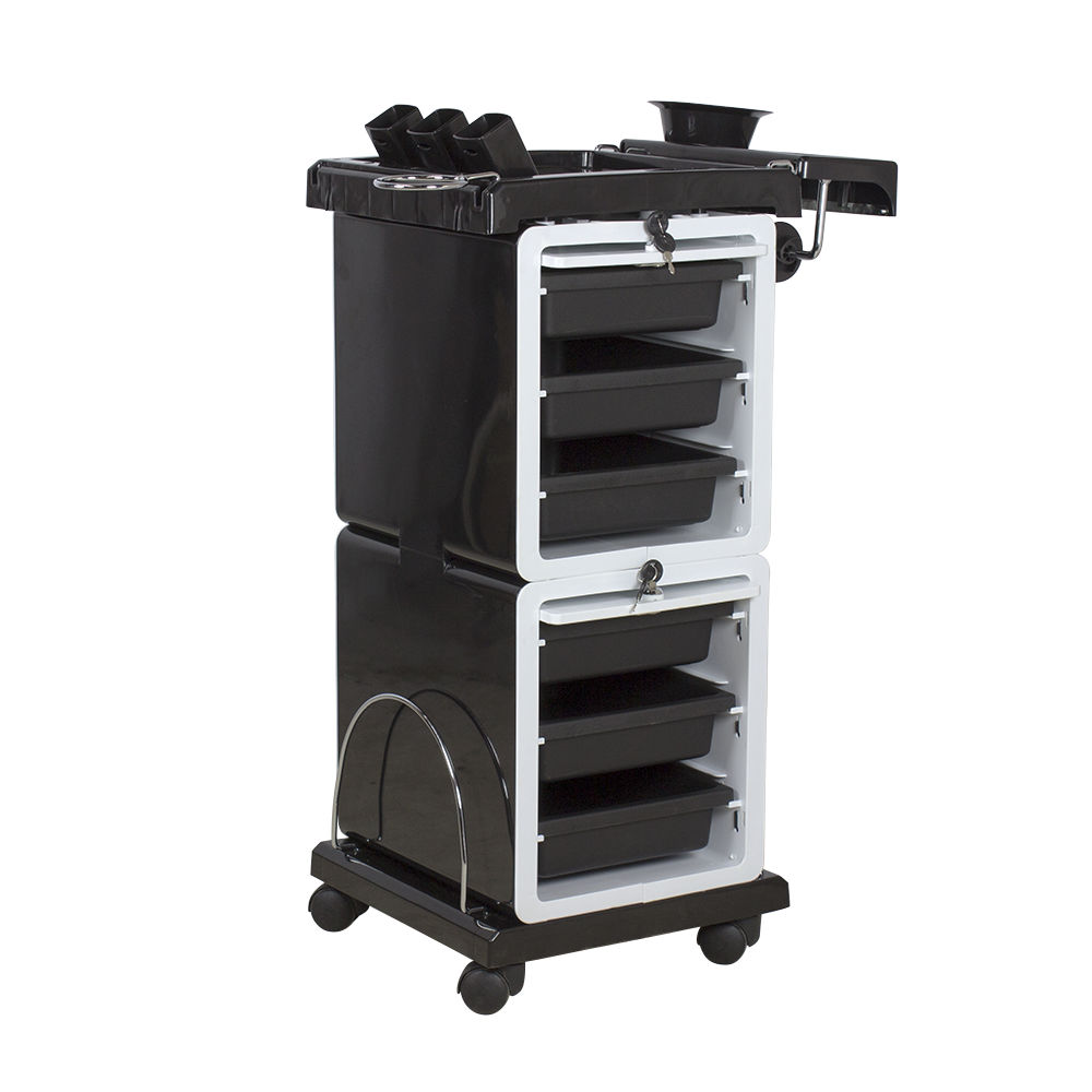 Комплектация: каркас, шесть ящиков, верхняя крышка со съемными блоками для рабочих принадлежностей, боковая полочка, держатель для фена, держатель для полотенец, основание на колесах, держатель для фольги с удобным отрезным краем, два держателя для буклетов с образцами красок для волос.
